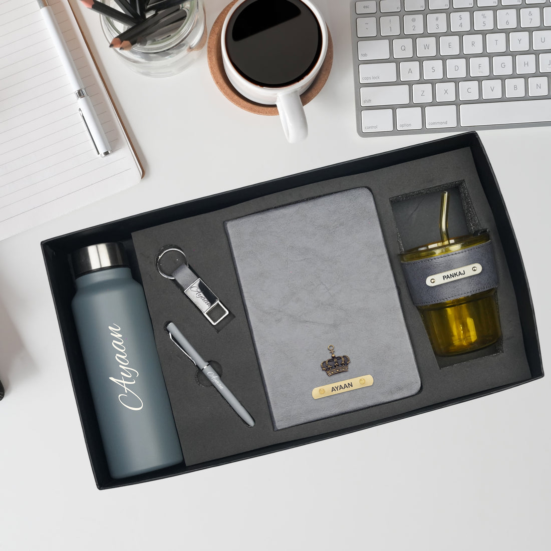 Classy Hardcover Diary + Classic Metal Pen + Classy Leather Metal Keychain + Classic Smart Bottle  +  Leather Sleeve Coffee Tumbler -Grey