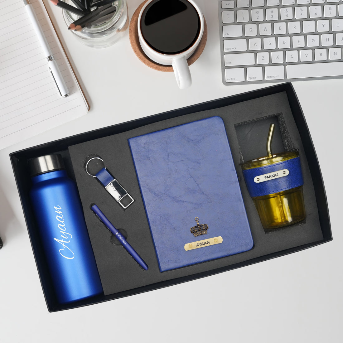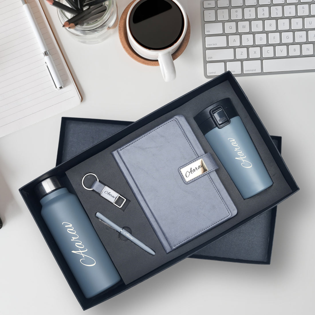Classy Hardcover Diary + Classic Metal Pen + Classy Leather Metal Keychain + Classic Smart Bottle  +  Leather Sleeve Coffee Tumbler -Blue