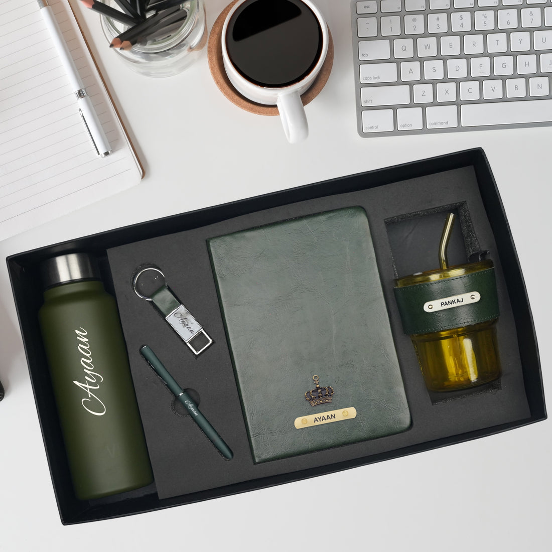 Classy Hardcover Diary + Classic Metal Pen + Classy Leather Metal Keychain + Classic Smart Bottle  +  Leather Sleeve Coffee Tumbler -Green