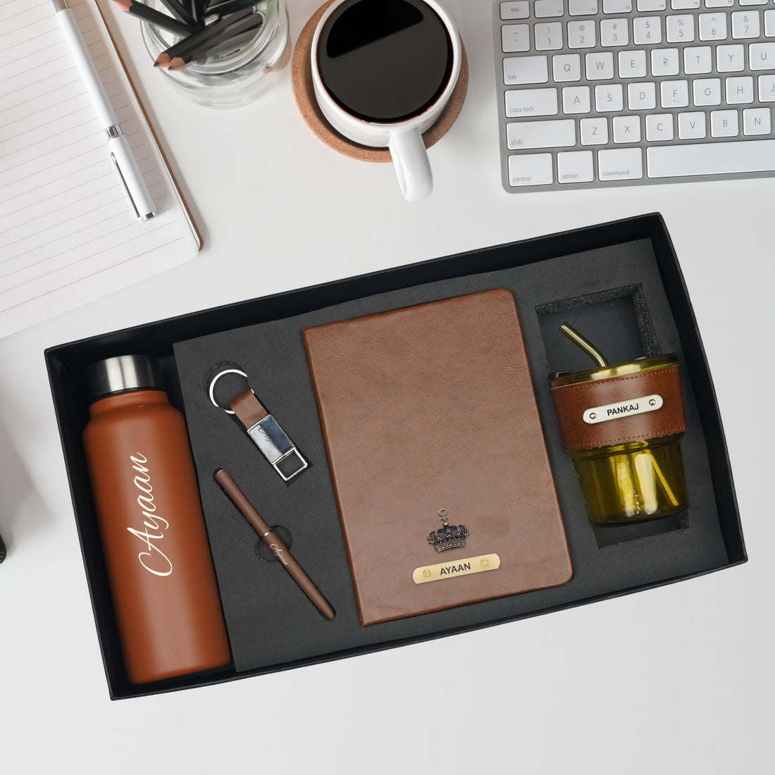 Classy Hardcover Diary + Classic Metal Pen + Classy Leather Metal Keychain + Classic Smart Bottle  +  Leather Sleeve Coffee Tumbler -TAN
