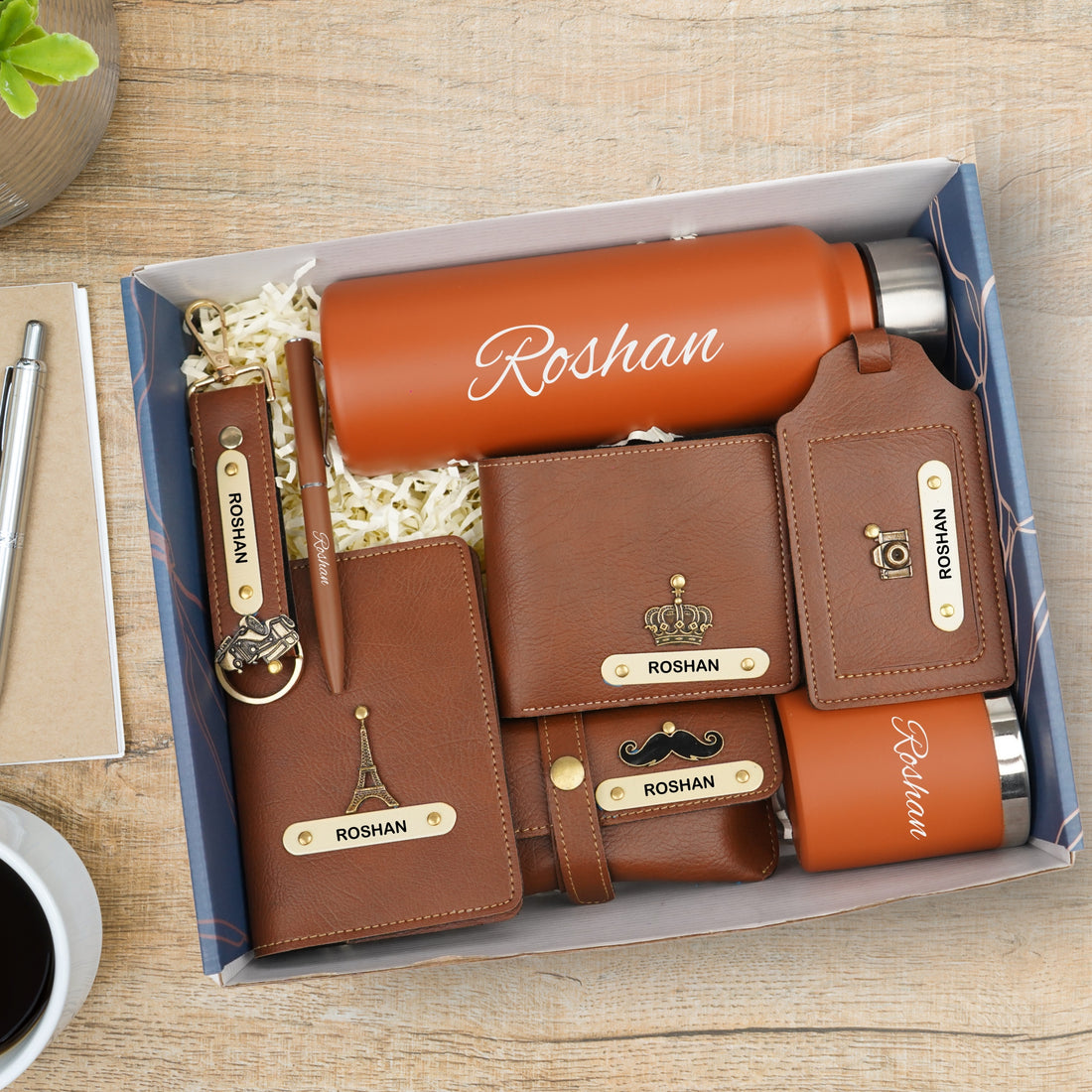 Customized men Gift with Name & Charm, Leather men's Wallett, Passport Cover, Water Bottle, Keychain, Customised Pen - Tann