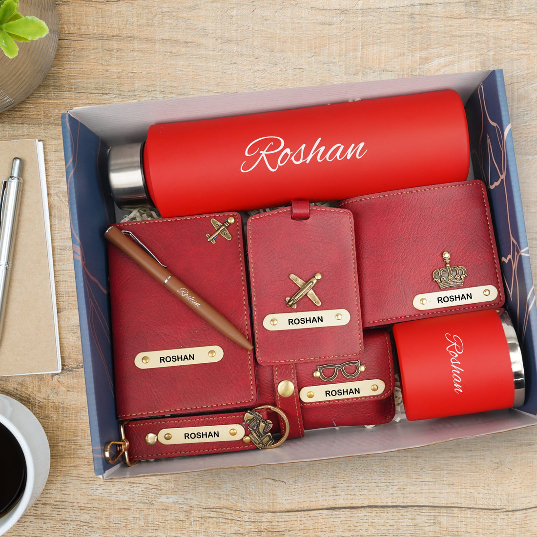 Customized men Gift with Name & Charm, Leather men's Wallett, Passport Cover, Water Bottle, Keychain, Customised Pen - Wine