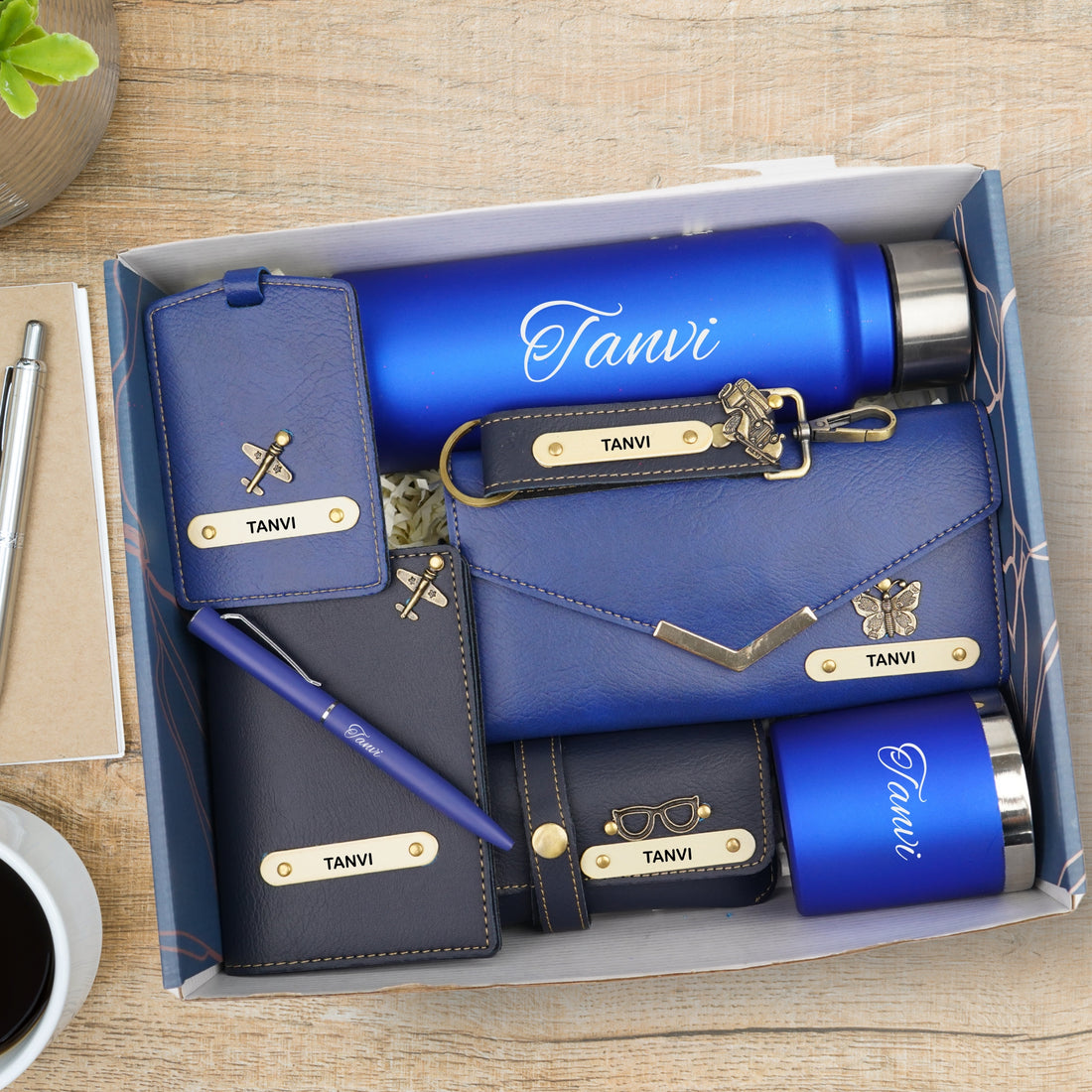 Customized Women Gift with Name & Charm, Leather Lady Wallett, Passport Cover, Water Bottle, Keychain, Customised Pen - Blue