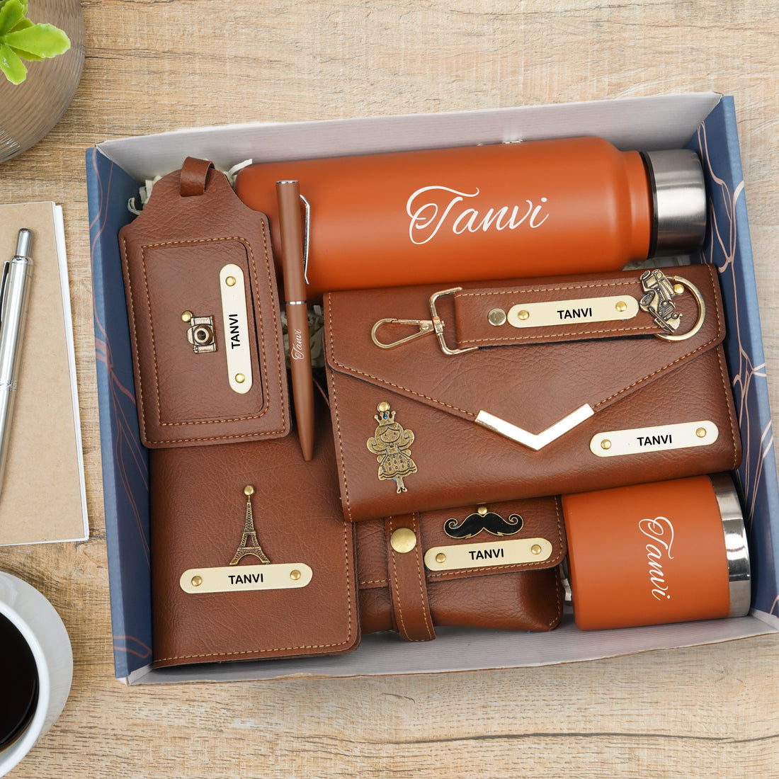 Customized Women Gift with Name & Charm, Leather Lady Wallett, Passport Cover, Water Bottle, Keychain, Customised Pen - Brown