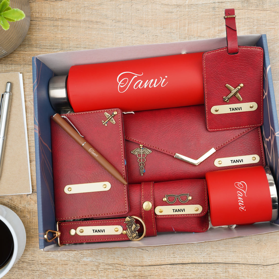 Customized Women Gift with Name & Charm, Leather Lady Wallett, Passport Cover, Water Bottle, Keychain, Customised Pen - Wine