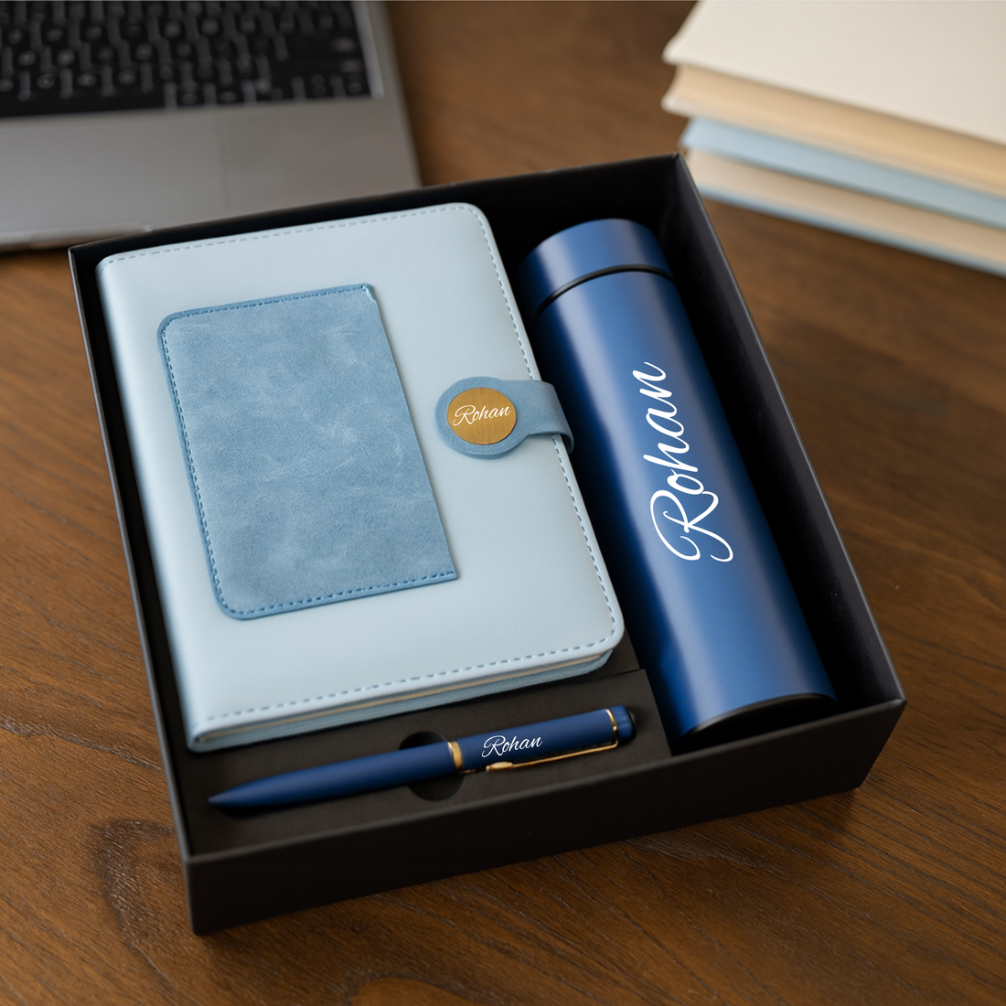 Dual Shade Diary+ Classic Metal Pen+ Temperature Bottle-BLUE