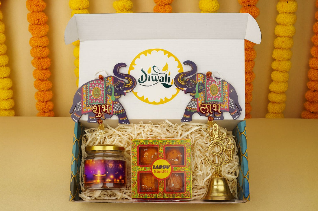 "Diwali Combo 2.0 – 2025 🎉 | Shubh Labh Latkan, Om Bell, Almonds & Ladoo Candles – Premium Gift Set"