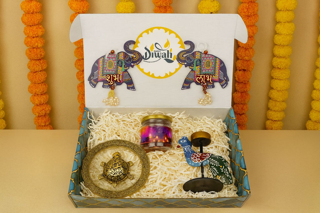 "Diwali Combo 3.0 – 2025 🎉 | Peacock Tea Candle, Kachua Lucky Charm, Almonds & Shubh Labh Latkan – Premium Gift Set"