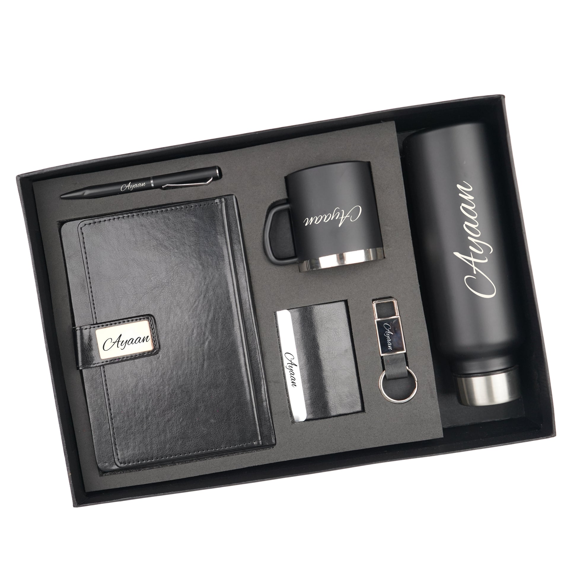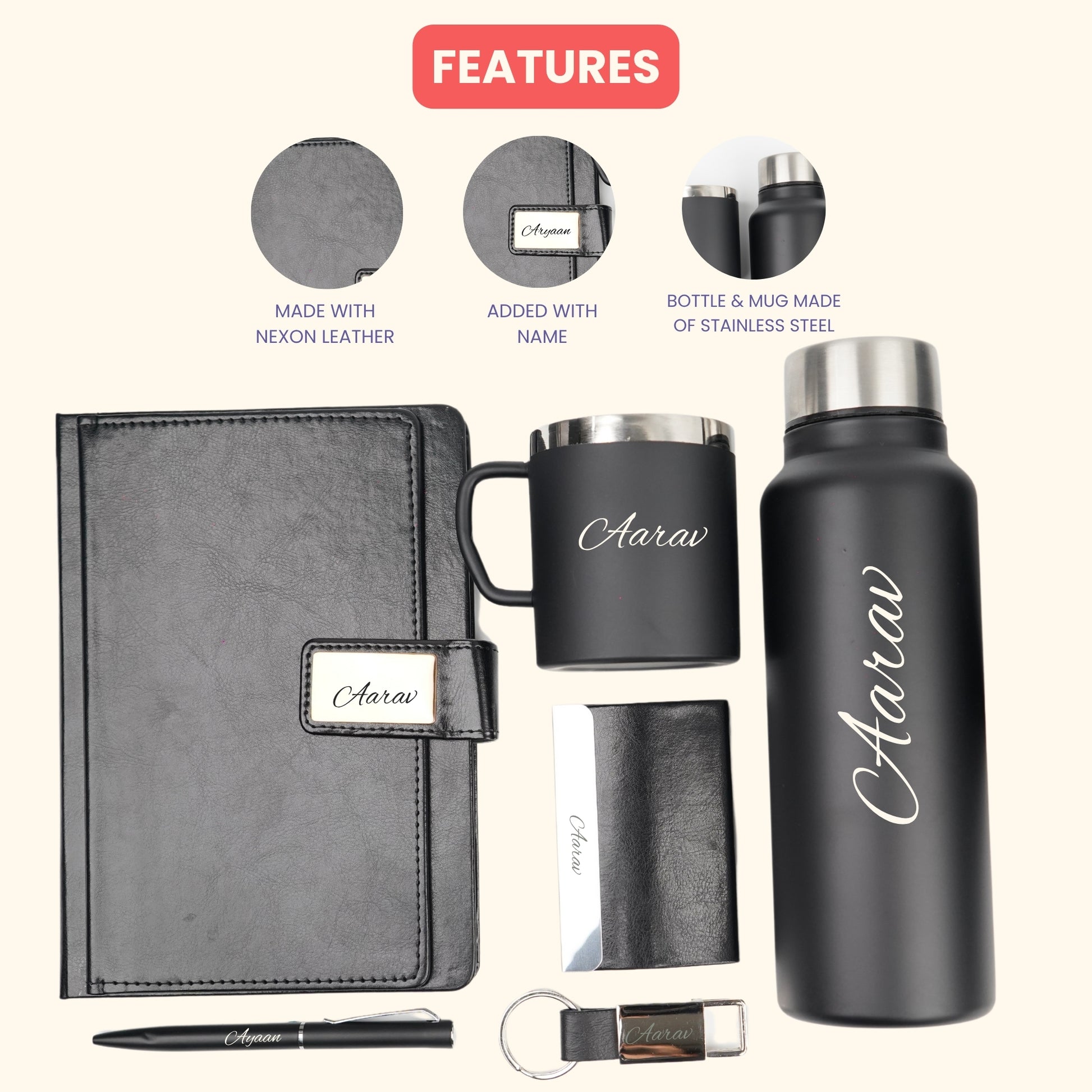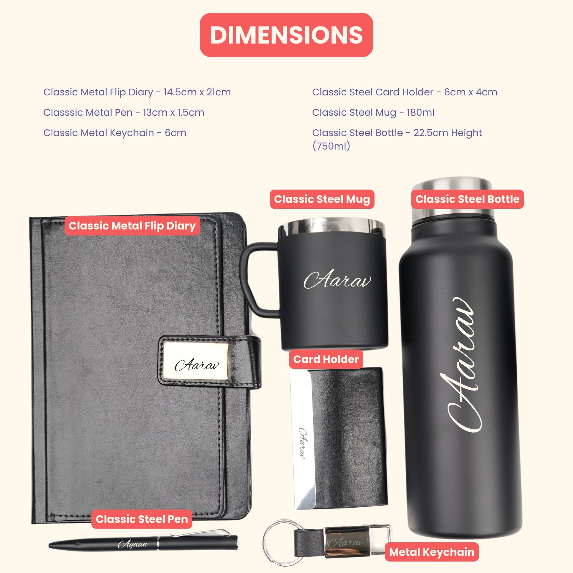 Classy Executive Diary + Classic Metal Pen + Classy Leather Metal Keychain + Classy Card Holder + Classic Smart Bottle + Stainless Steel Mug - Black