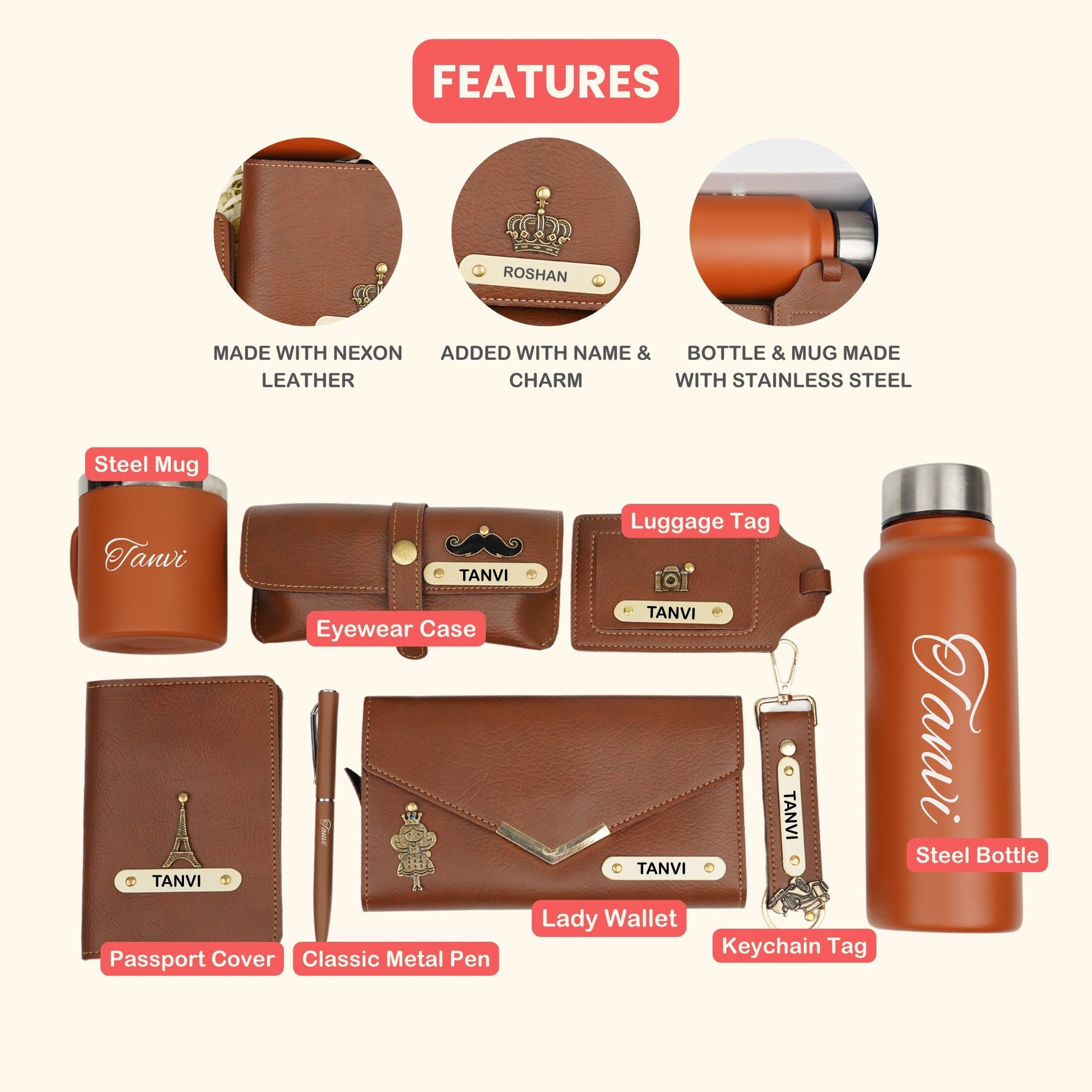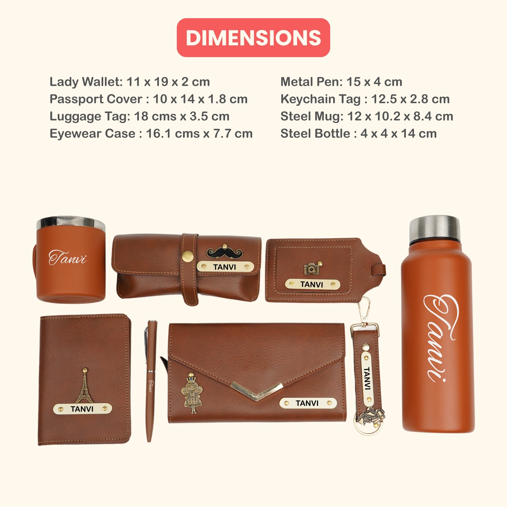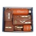 Customized Women Gift with Name & Charm, Leather Lady Wallett, Passport Cover, Water Bottle, Keychain, Customised Pen - Tan