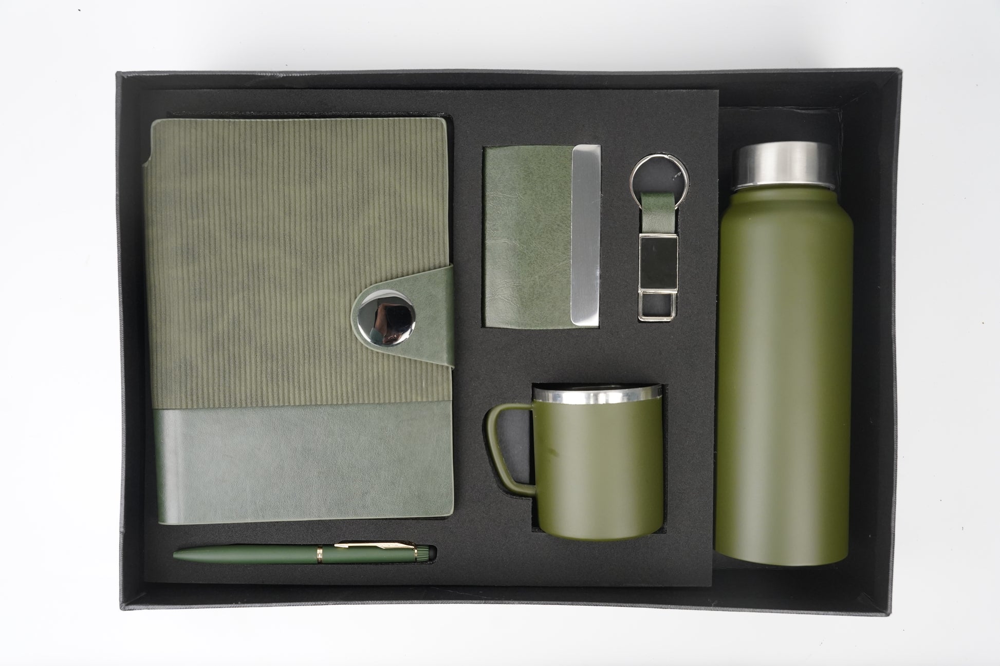 Nexon Metal Flip Diary + Nexon Metal Pen + Classy Leather Metal Keychain + Classy Metal Card Holder + Classic Smart Bottle + Stainless Steel Mug - GREEN