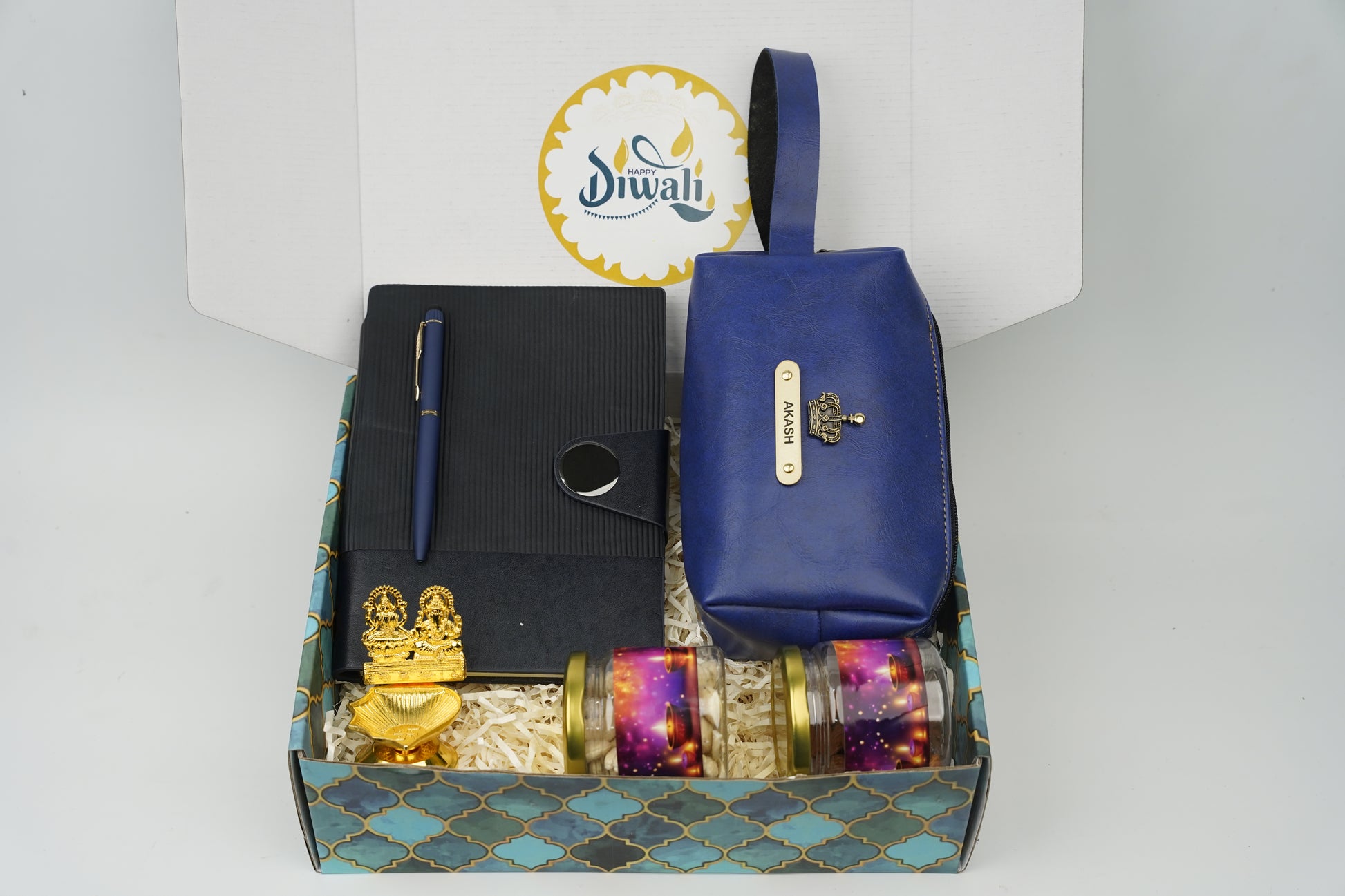 "Personalized Diwali Gift Hamper 10.0-BLUE ✨ Nexon Gift Hamper – Flip Diary, Pen, Pouch, Laxmi Ganesh Metal Diya, Almond & Kaju Jars, Designer Box | Festive & Corporate Gifting 🎁