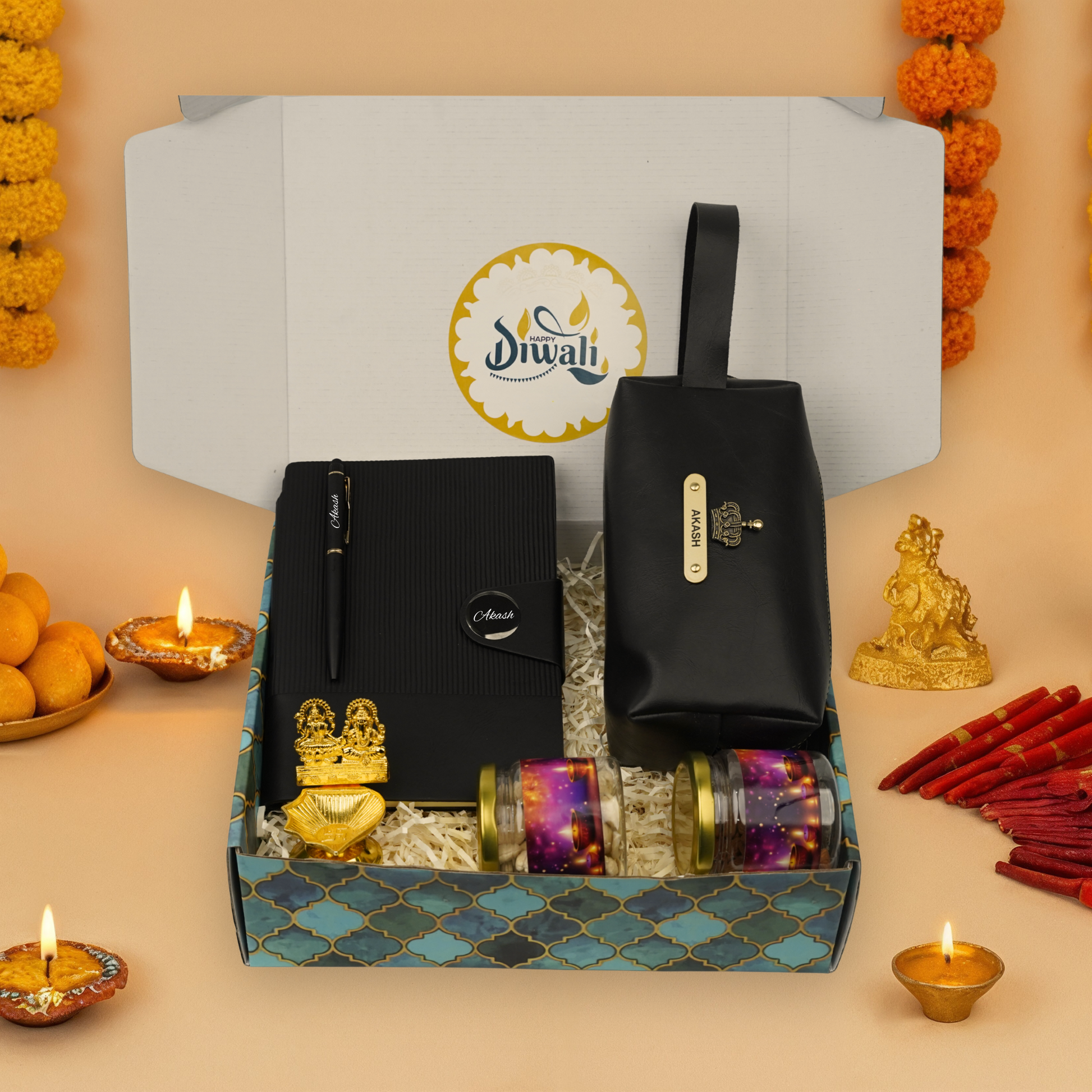 "Personalized Diwali Gift Hamper 10.0-BLACK✨ Nexon Gift Hamper – Flip Diary, Pen, Pouch, Laxmi Ganesh Metal Diya, Almond & Kaju Jars, Designer Box | Festive & Corporate Gifting 🎁