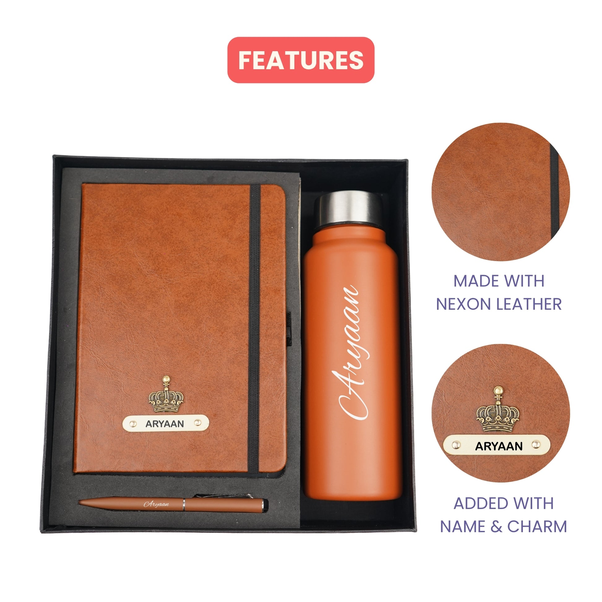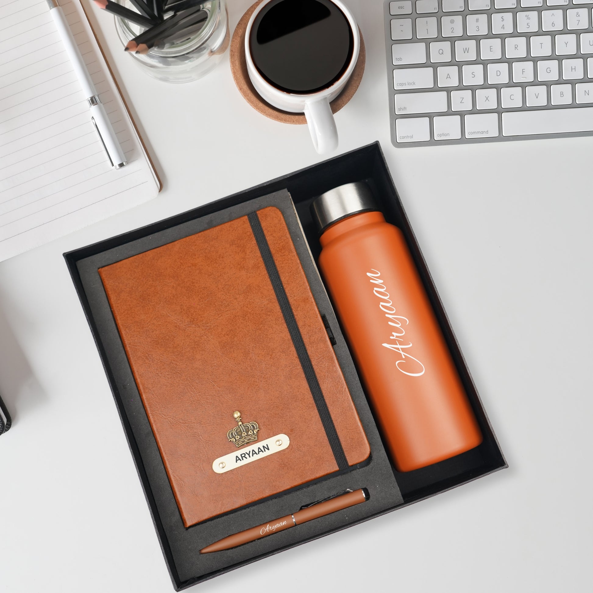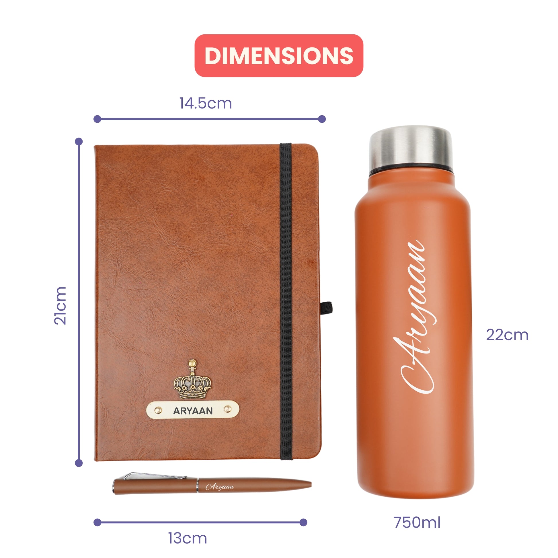 Classy Hardcover Diary + Classic Metal Pen + Classic Smart Bottle - Tan