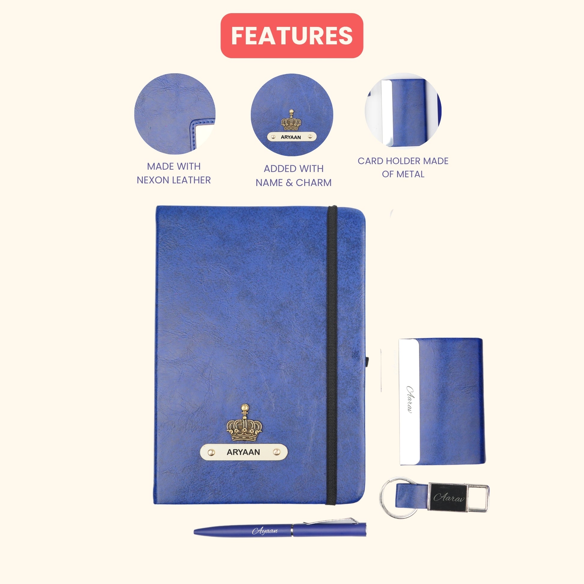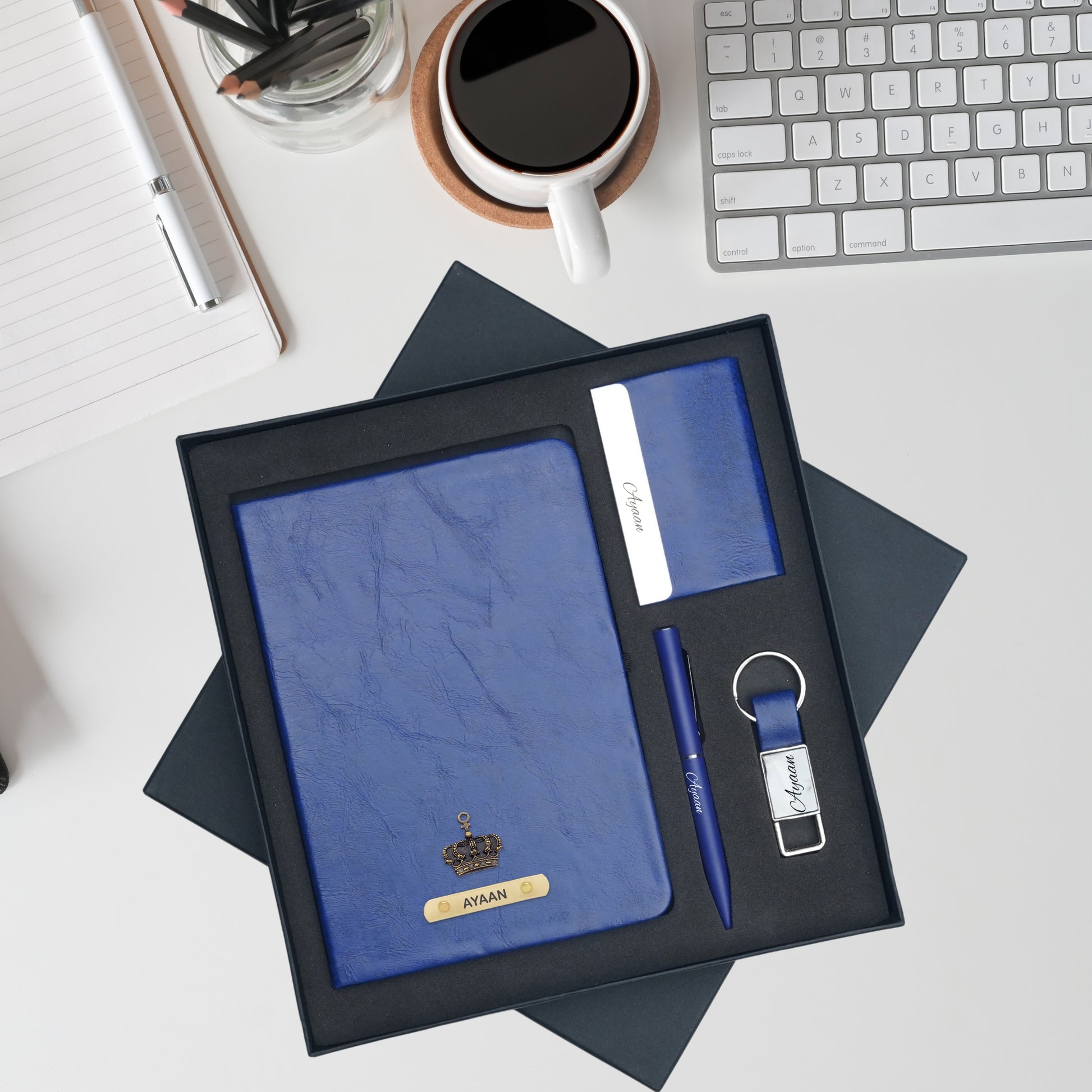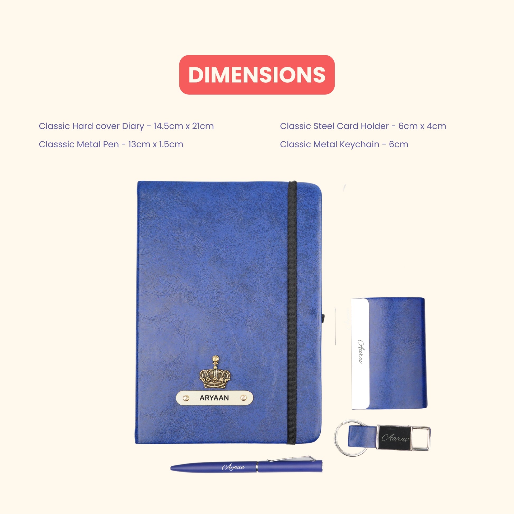 Classy Hardcover Diary + Classic Metal Pen + Classy Leather Metal Keychain + Classy Card Holder - Blue
