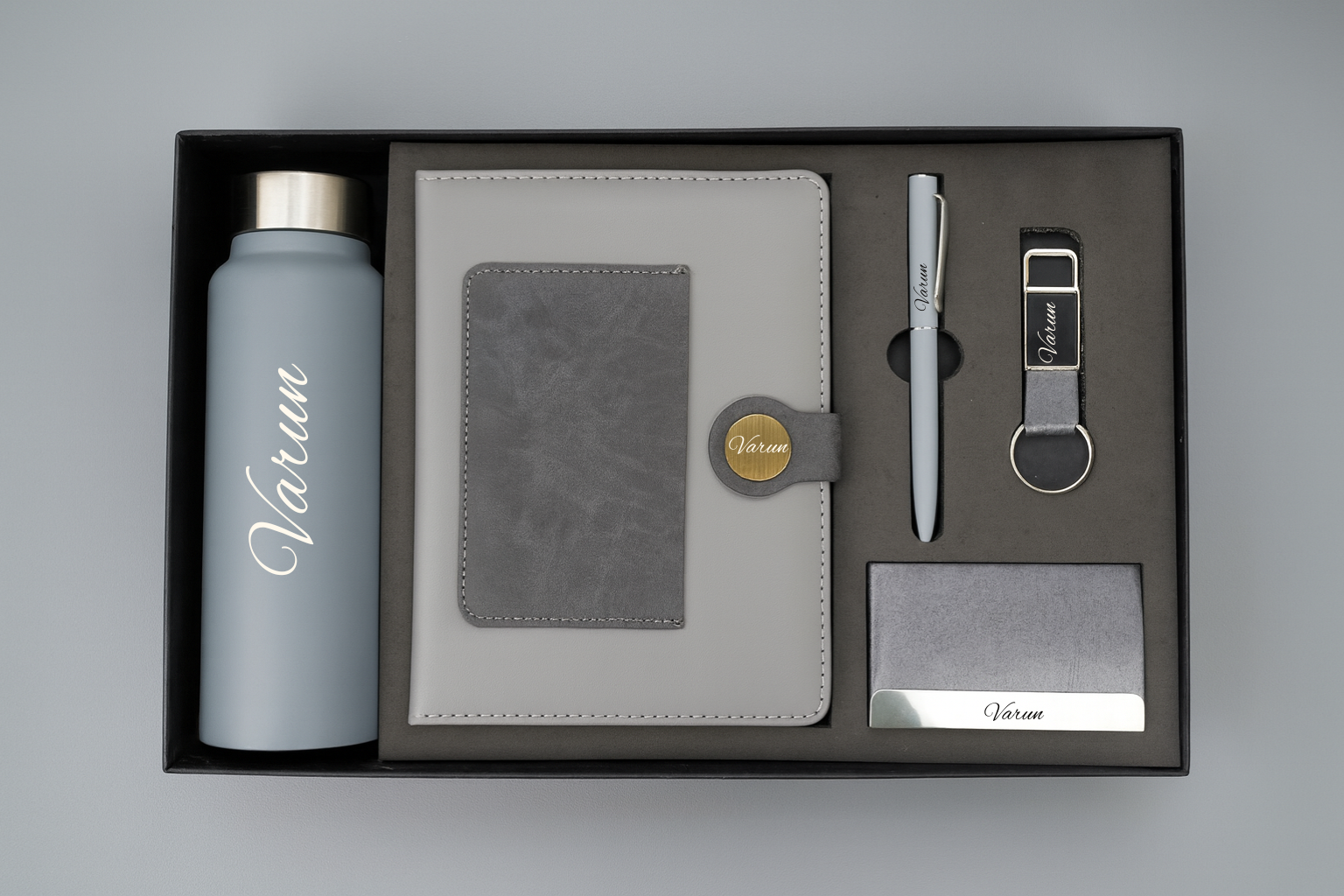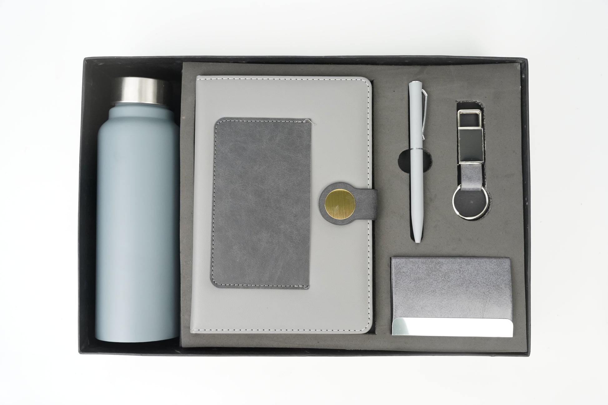 Dual Shade Diary + Classic Metal Pen + Classy Leather Metal Keychain +Classy Card Holder + Classic Smart Bottle - GREY