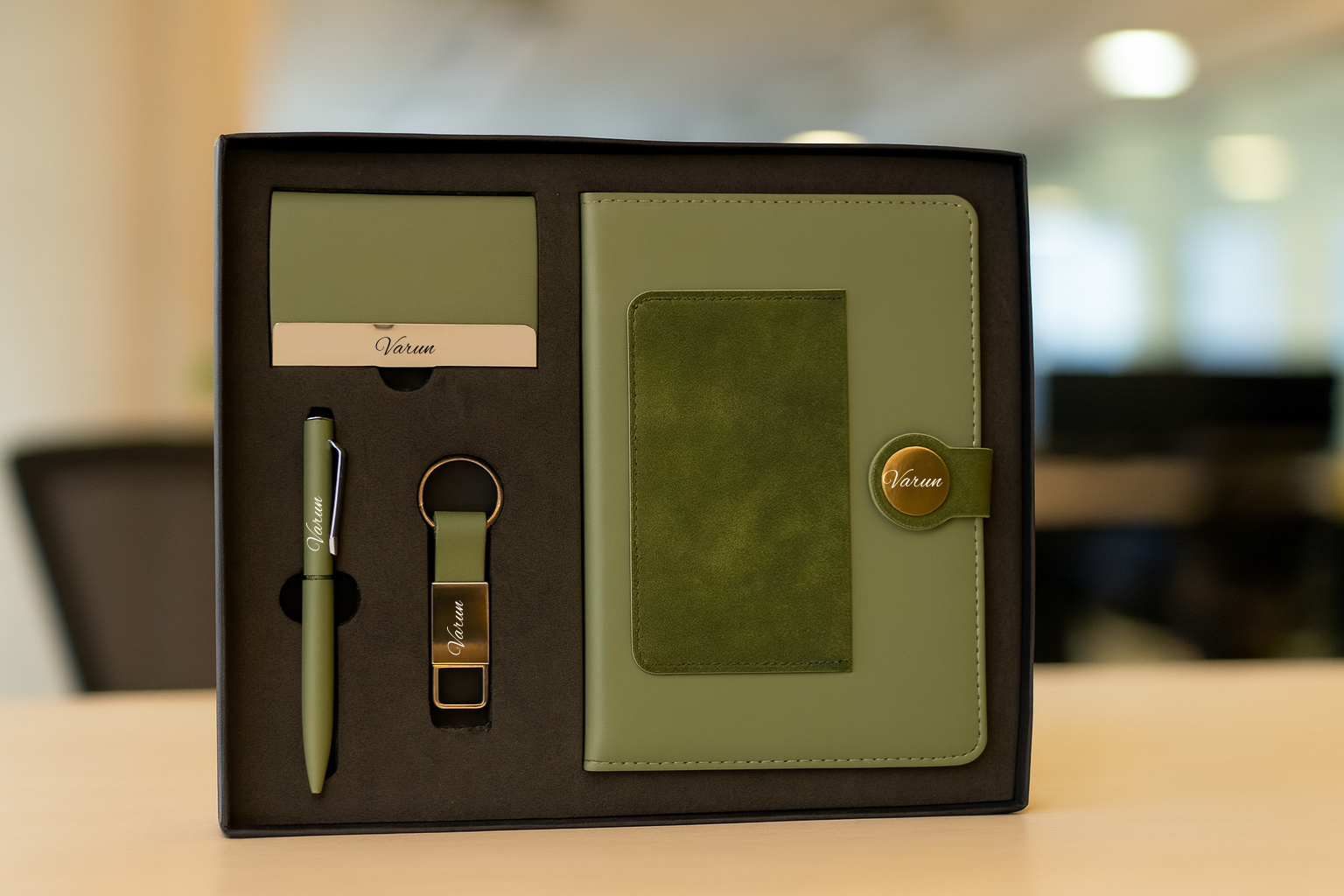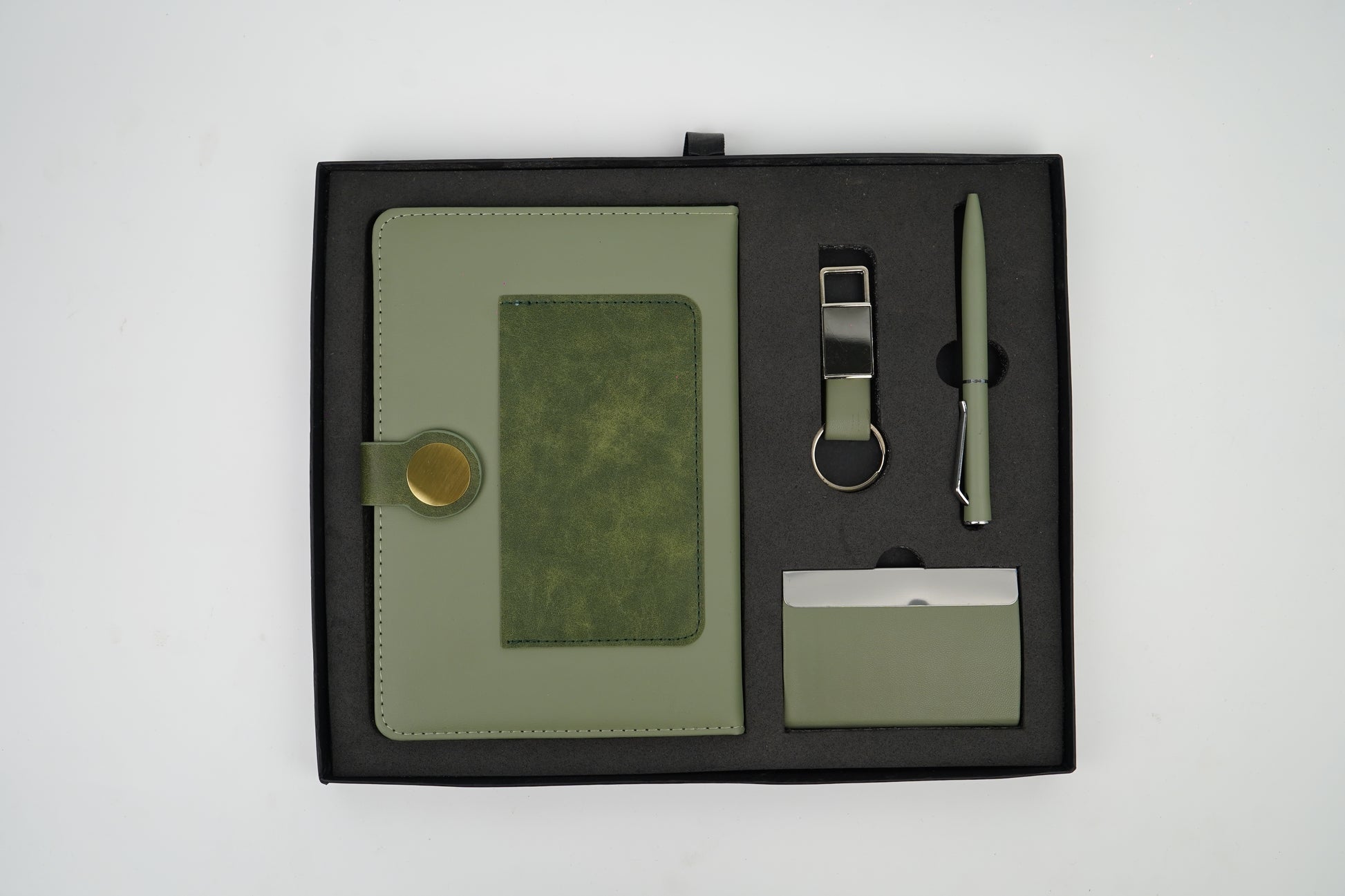 Dual Shade Diary + Classic Metal Pen + Classy Leather Metal Keychain +Classy Card Holder - GREEN