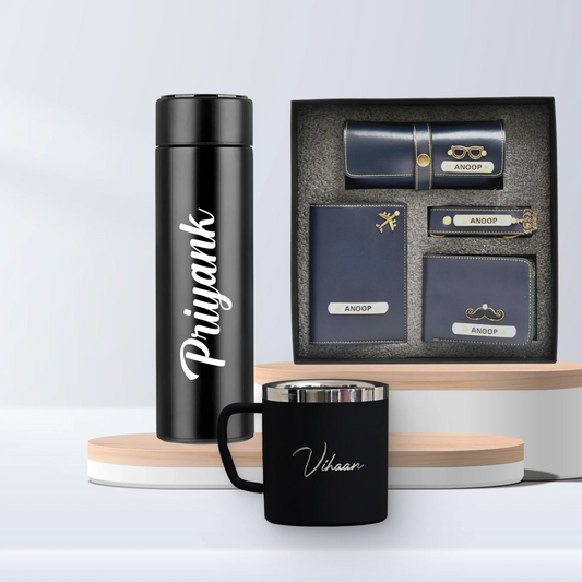 Personalized Temperature Bottle , Stainless Steel Mug & All in One Men's Combo (4 pcs) - Black