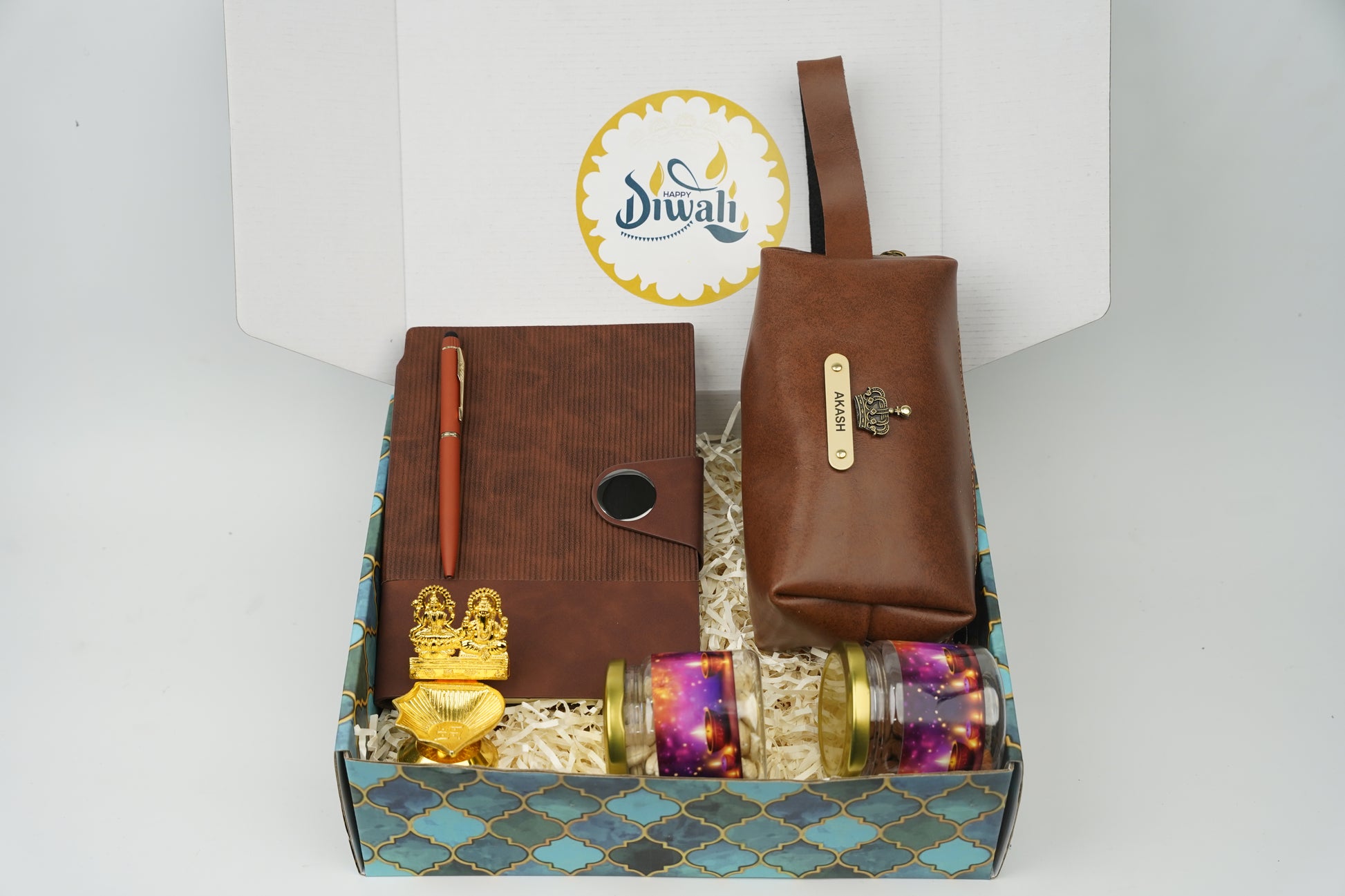 "Personalized Diwali Gift Hamper 10.0-BROWN✨ Nexon Gift Hamper – Flip Diary, Pen, Pouch, Laxmi Ganesh Metal Diya, Almond & Kaju Jars, Designer Box | Festive & Corporate Gifting 🎁