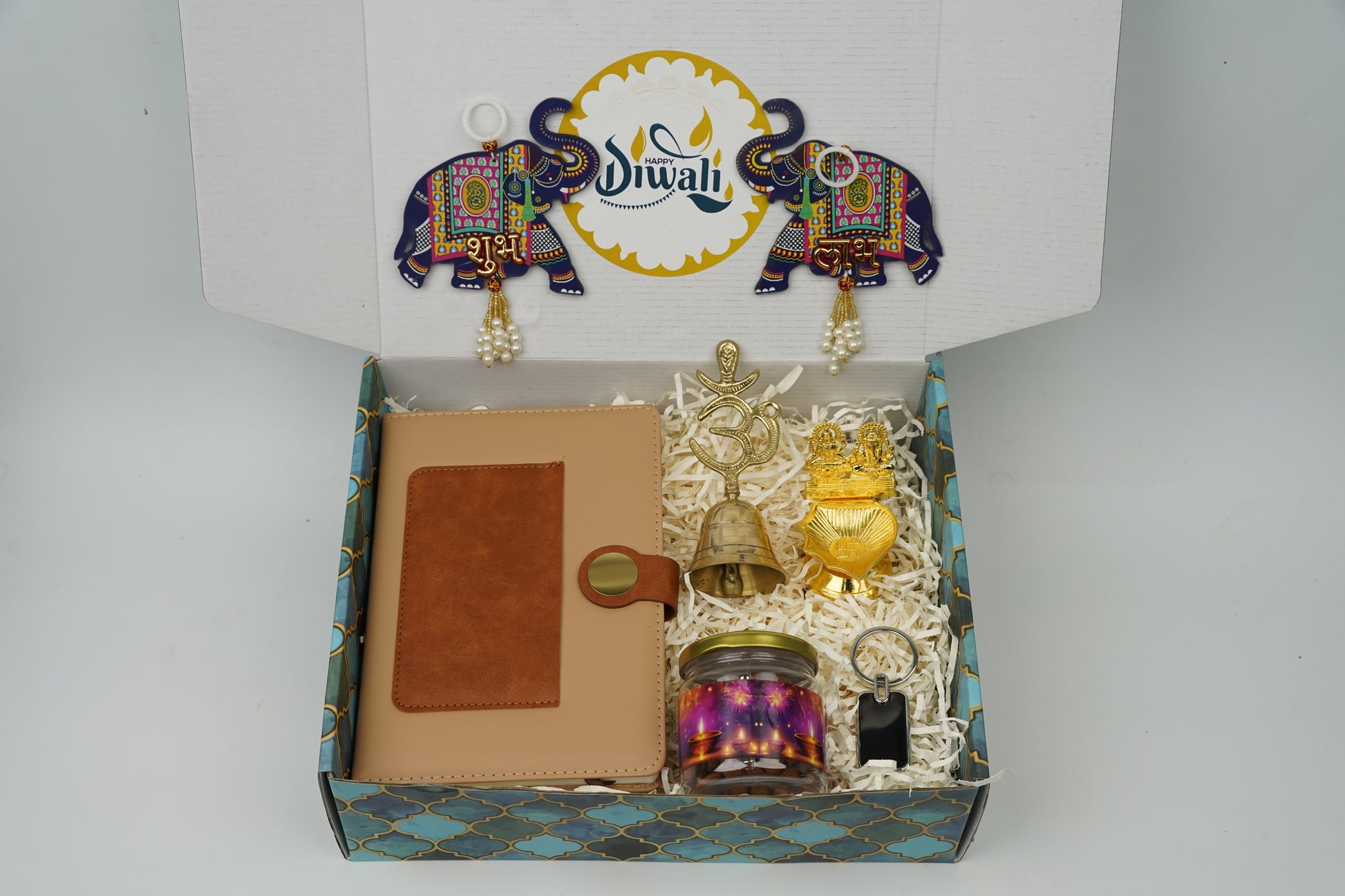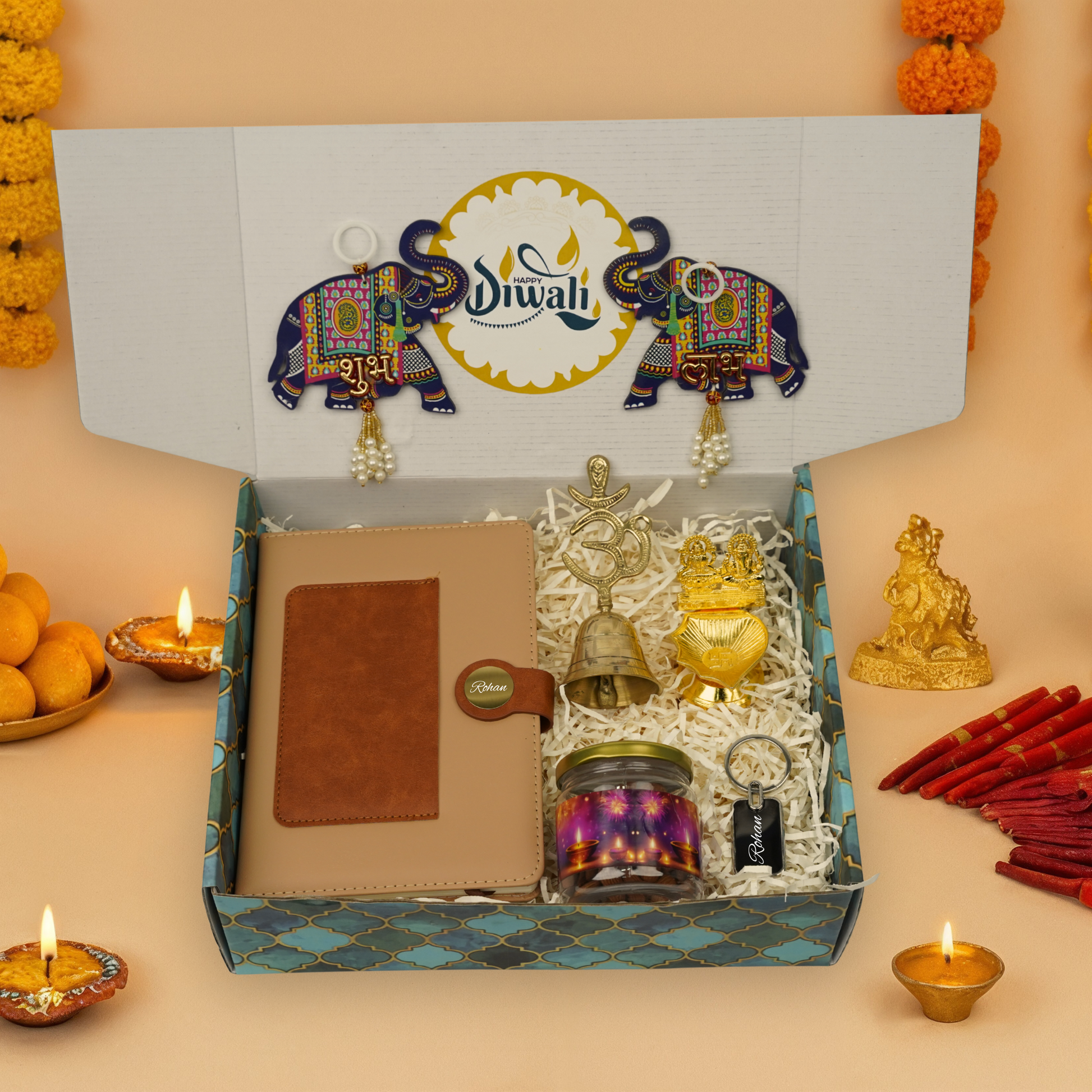 "Personalized Diwali Gift Hamper 2.0-TANN“Dual Shade Diary, Metal Keychain, Om Brass Bell, Laxmi Ganesh Diya, Almond Jar & Shubh Labh Latkan – Festive Gift Box”