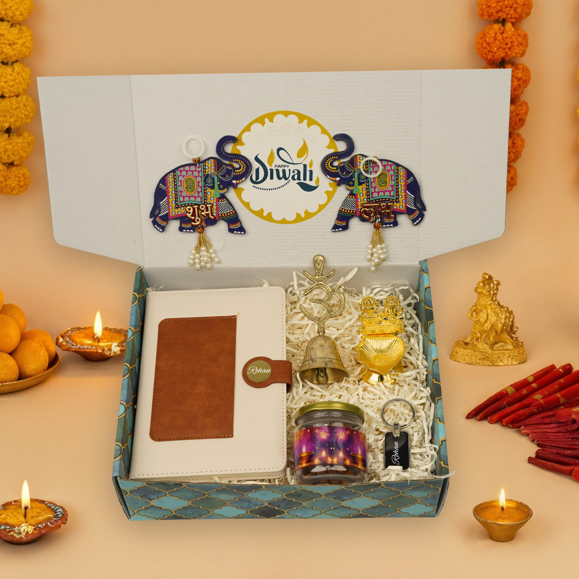 "Personalized Diwali Gift Hamper 2.0-WHITE “Dual Shade Diary, Metal Keychain, Om Brass Bell, Laxmi Ganesh Diya, Almond Jar & Shubh Labh Latkan – Festive Gift Box”