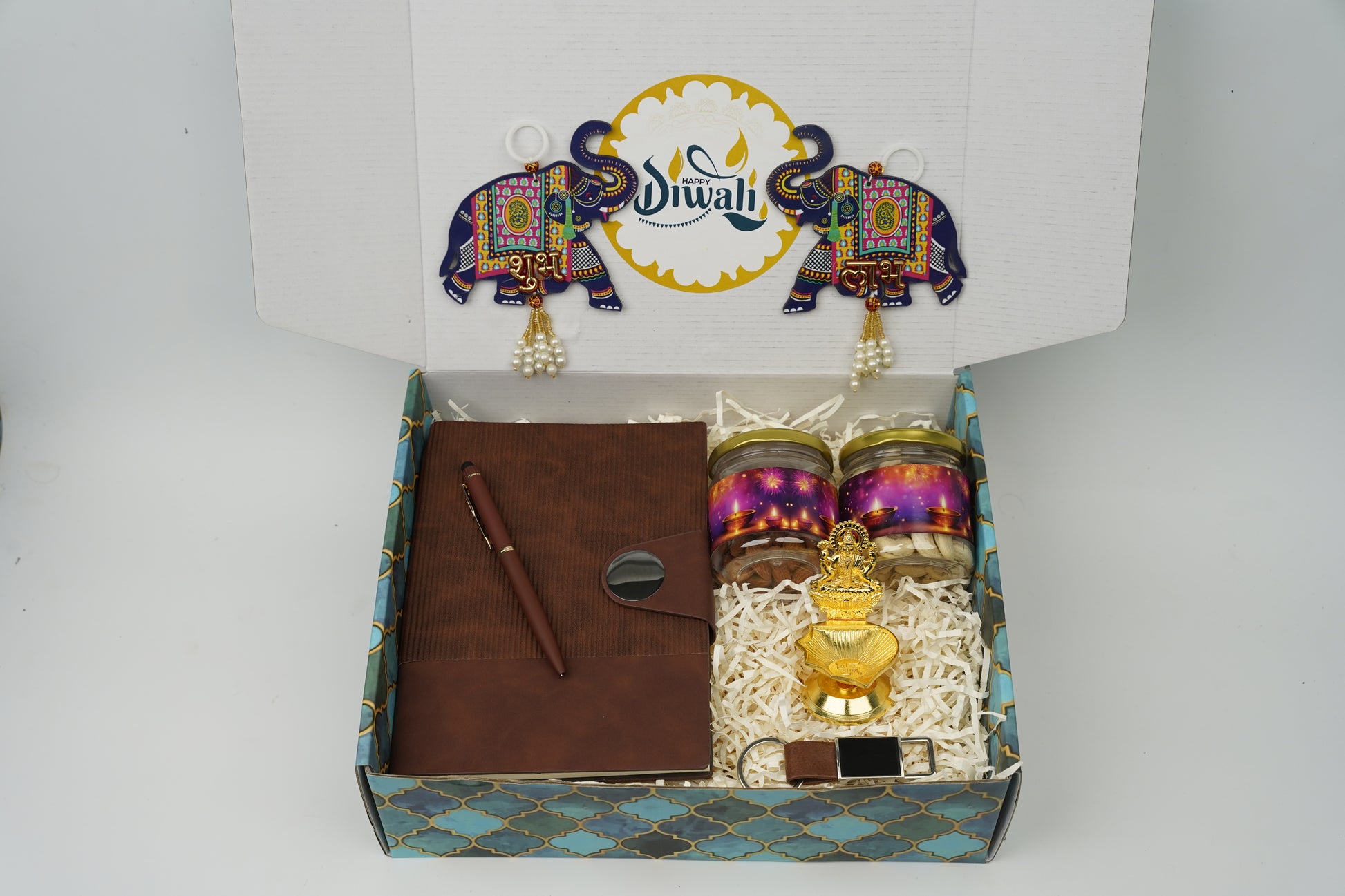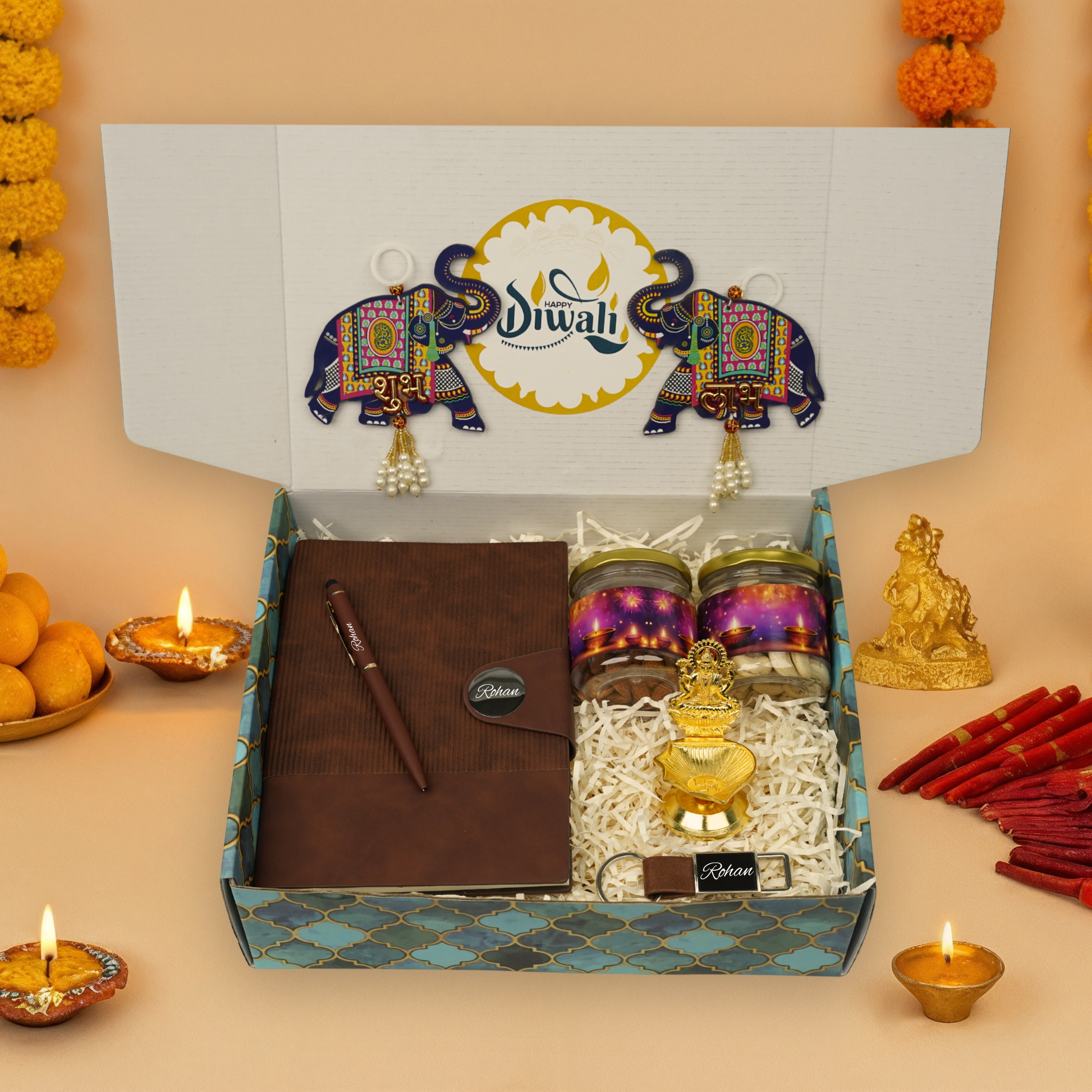 "Personalized Diwali Gift Hamper 3.0-BROWN✨ Nexon Flip Diary, Brass Pen, Metal Keychain, Laxmi Ji Diya, Shubh Labh Latkan, Kaju & Almond Jars, Designer Box | Festive & Corporate Gift Hamper 🎁